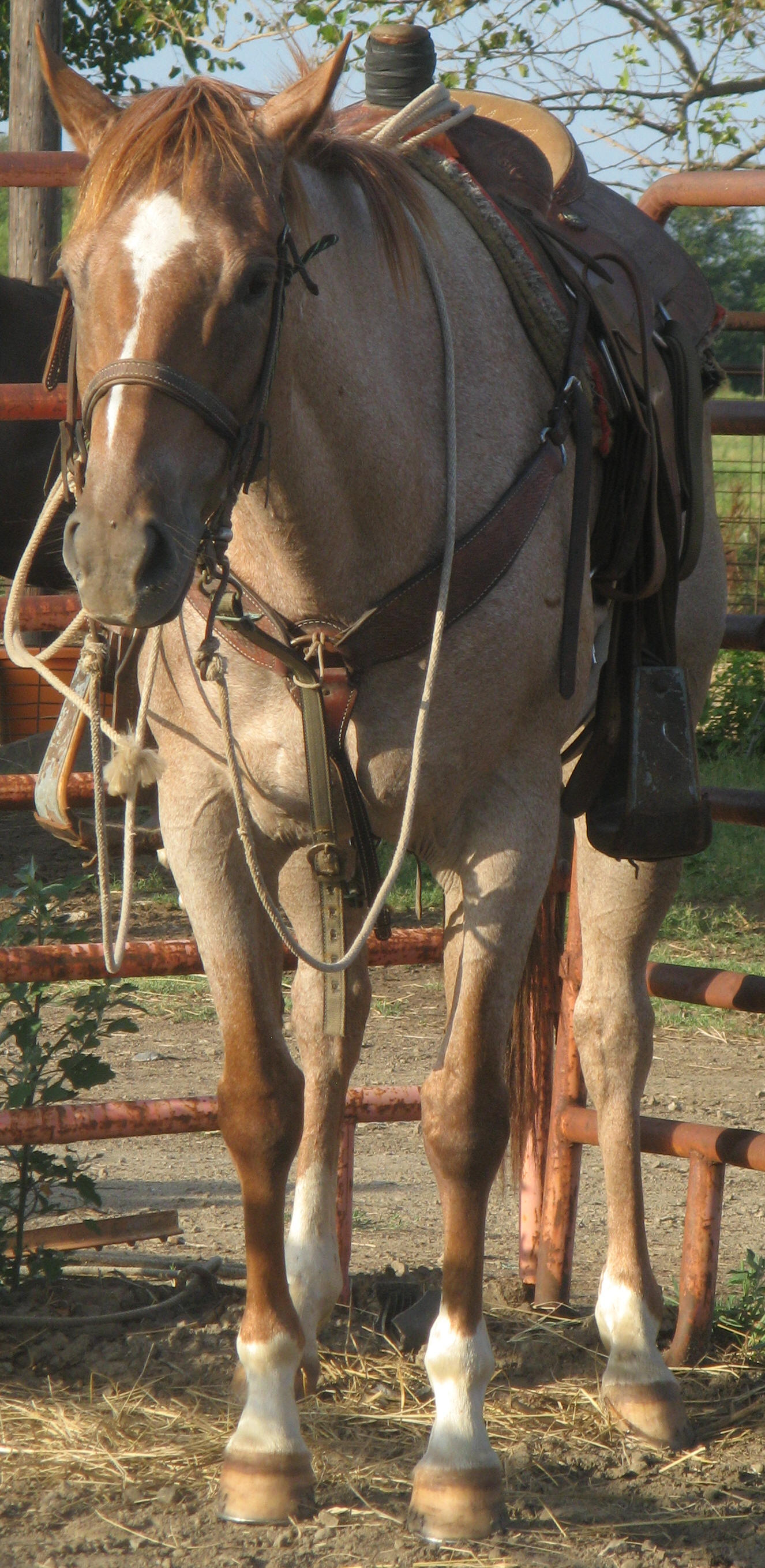 Rebecca MD Dash, aka Reba, is a red roan mare. She is registered AQHA (#4573217). She was born May 2004.