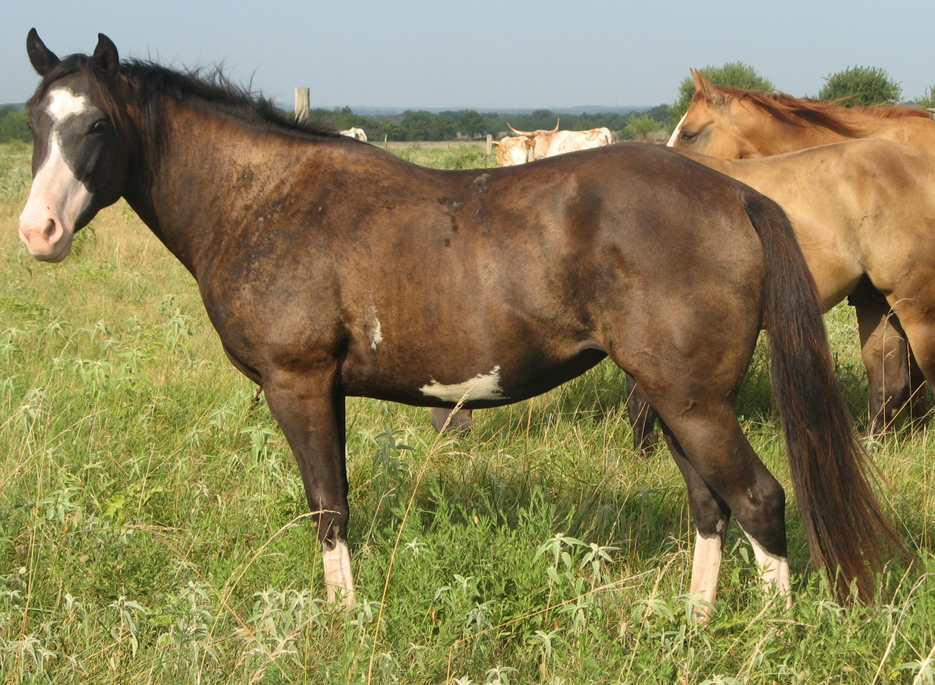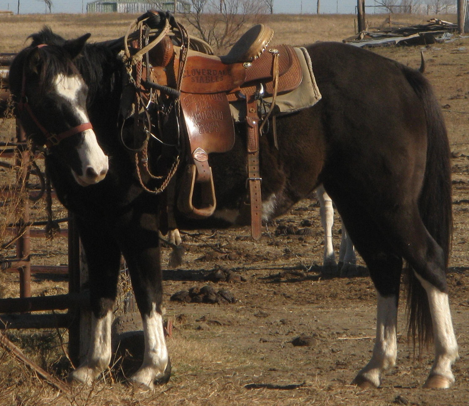 Zans Twinkle Hancock, aka Twinkie, is a black overo mare. She is registed APHA (#840874). This paint mare was born March 2005 and is a really gentle, laid-back horse. Twinkie is 14 hands tall. She is a finished heel horse.
